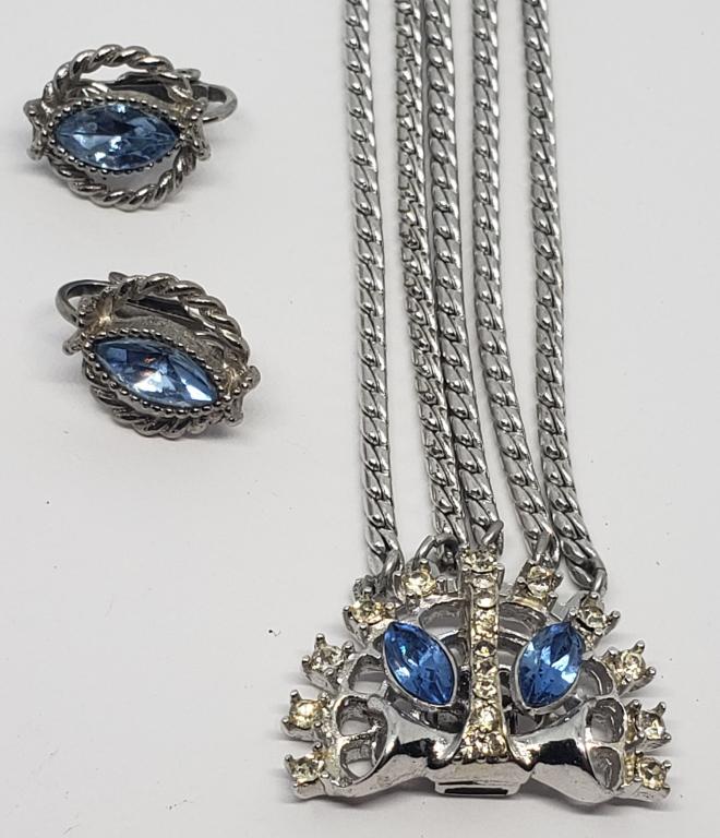 Vintage BSK Blue Aurora Borealis Rhinestone Silver Tone Necklace and Clip Earrings SetGolden Age Jewelry Auctions4.5(57)$6Mar 05, 2026