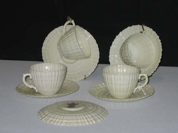 SET/4 BELLEEK CUPS/5 SAUCERS. BLACK MARK.