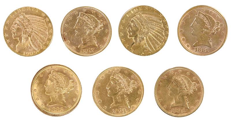 Seven $5 Gold Coins