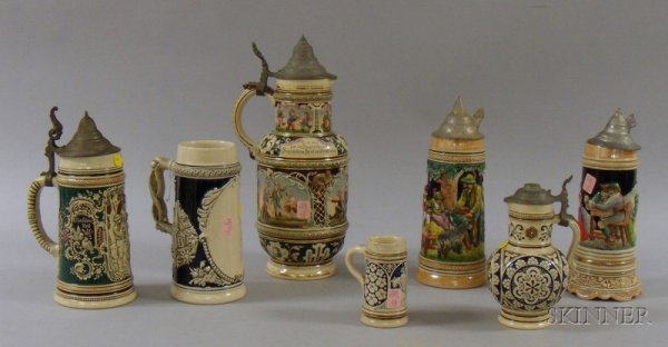 Seven Assorted German Stoneware Steins.