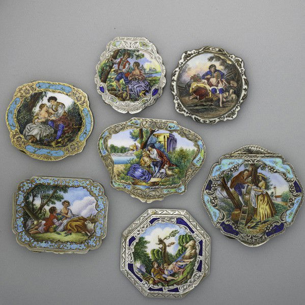 SEVEN CONTINENTAL ENAMELED SILVER COMPACTS