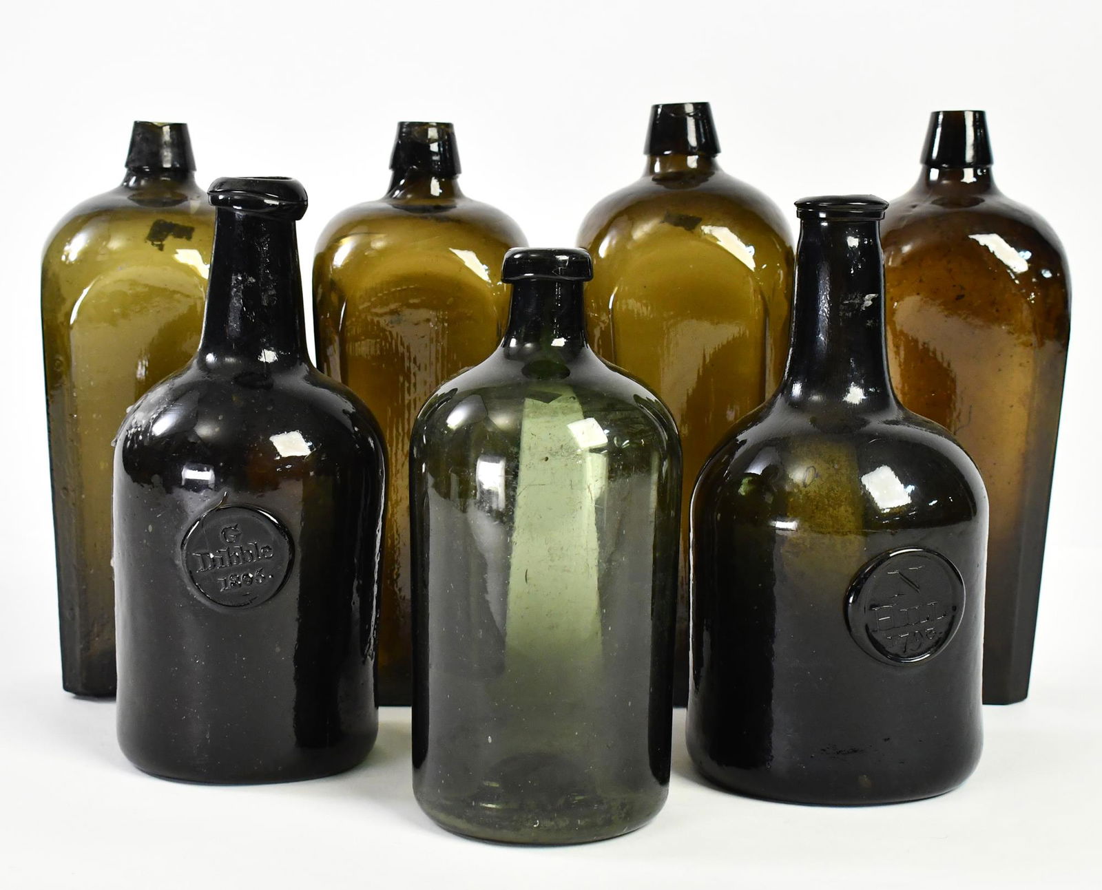 SEVEN EARLY WINE AND GIN BOTTLES.