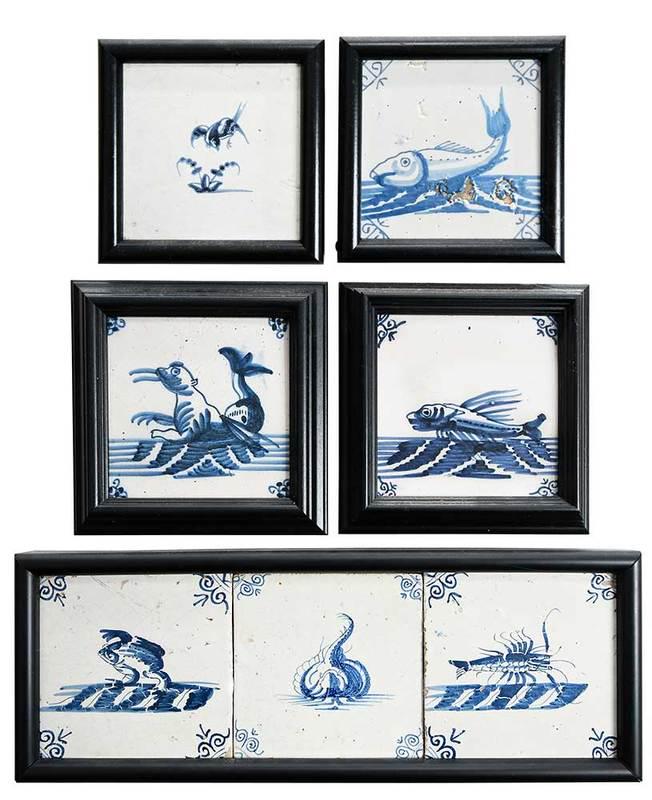 Seven Framed Animal Delftware Tiles