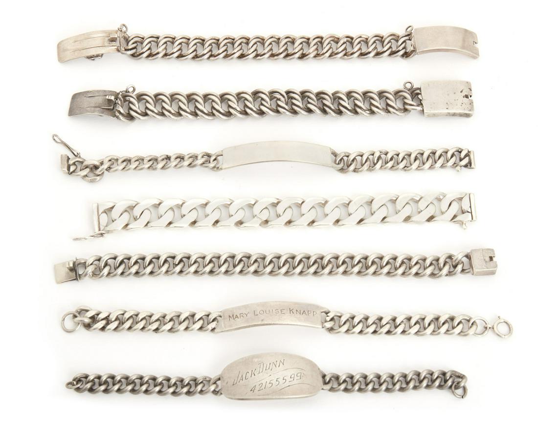 Seven silver and metal ID bracelets