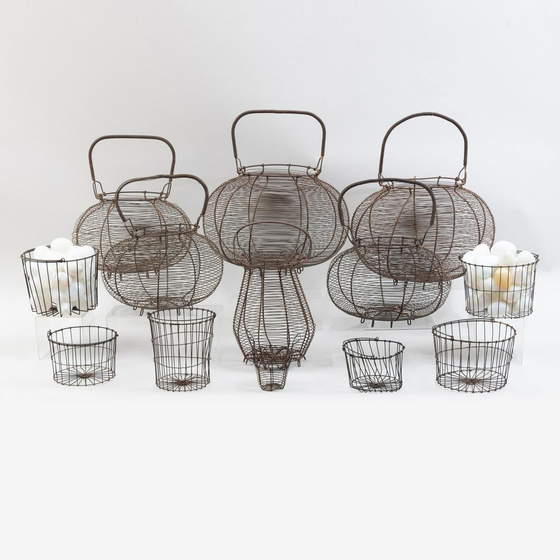 Seven Wirework Onion Baskets, Six Wirework Pails and a