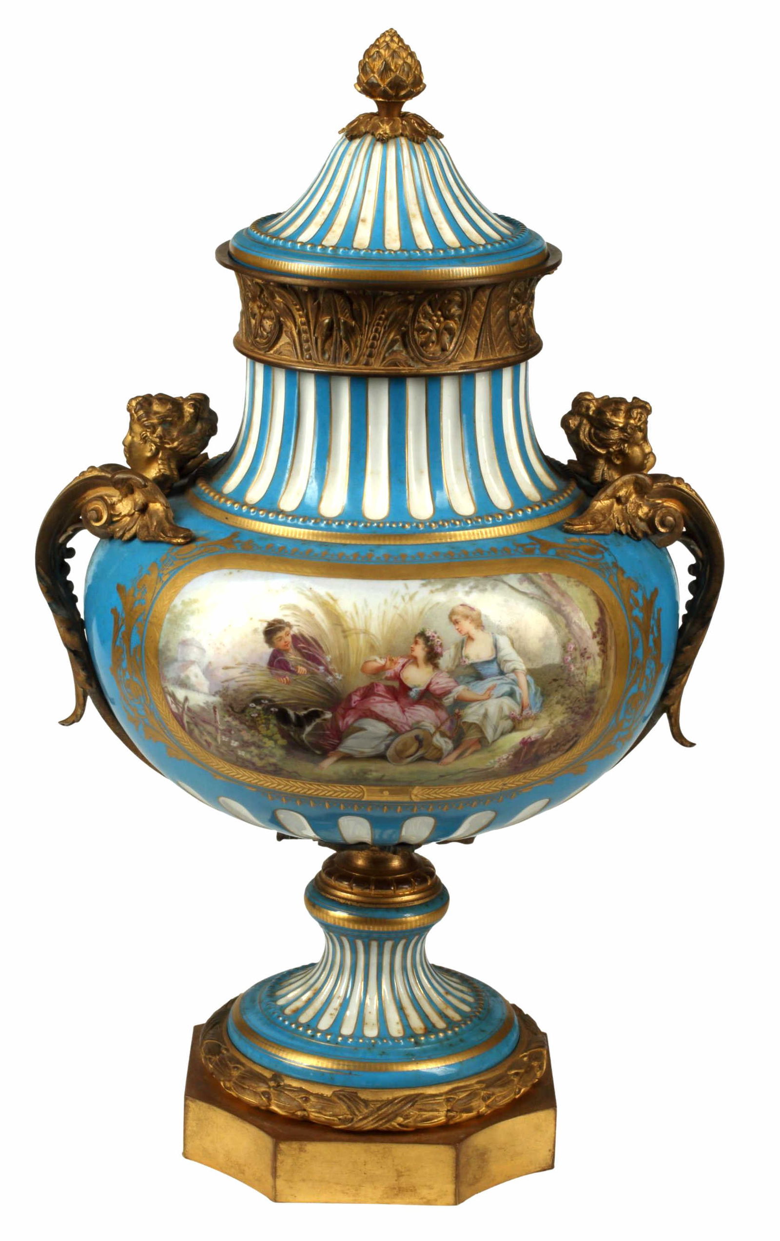 SoldSevres Style Ormolu Mounted Porcelain UrnFeaturing Figural Handles And Painted Garden Scene. 15 X 8 X 5.5 Inches, Lacking Lid. See Photos For Additional Condition Information.See Sold Price