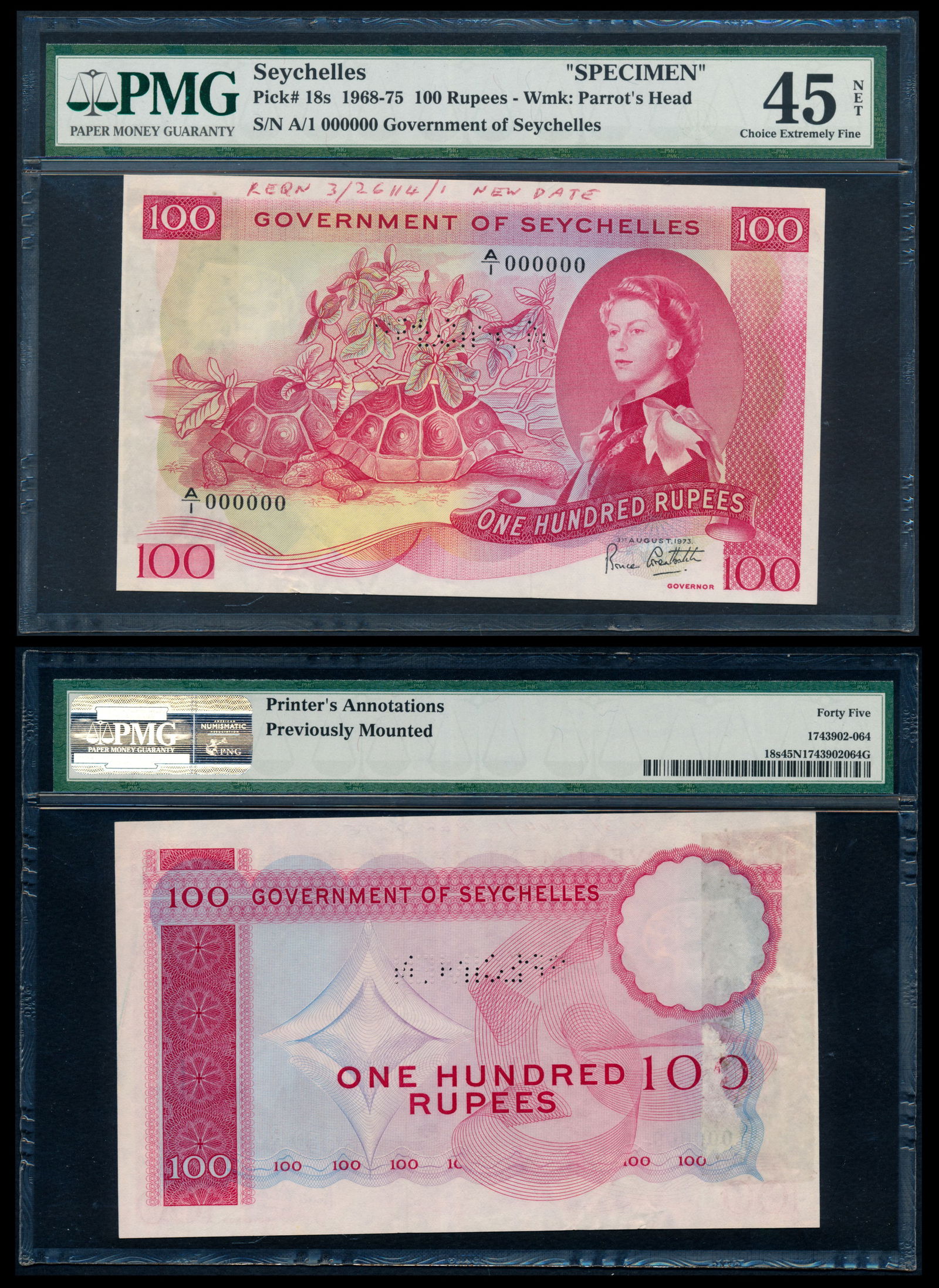 Seychelles 100 Rupees 1968-75 QEII specimen