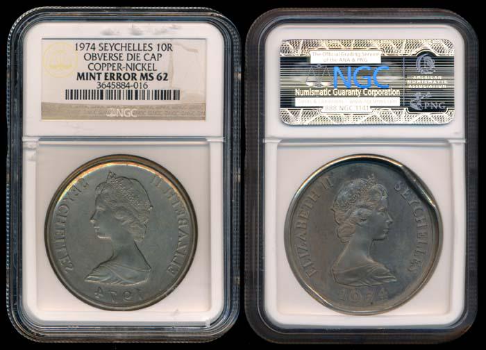 Seychelles QEII 10Rupees 1974 mint error NGC