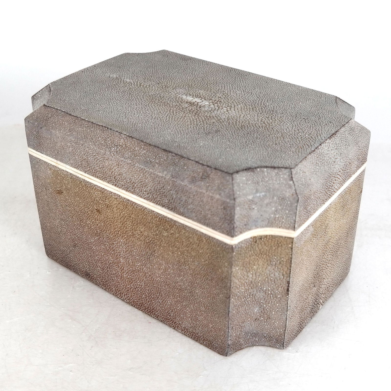 SoldEnglish white Shagreen box with wood liningEnglish white Shagreen box with wood lining, mid 20th C., 4" X 5 1/4" X 3 1/4"See Sold Price