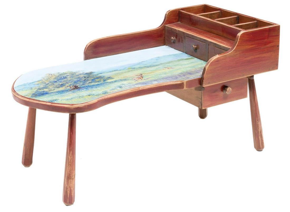 SoldShawn Bridges (20th C., TX), Interesting Game DeskShawn Bridges (20th C., Texas), interesting hand painted desk, featuring colorful game motif, Monopoly game top with poker card motif flanking two sides, eight drawers with metal hardware, unsigned 3See Sold Price