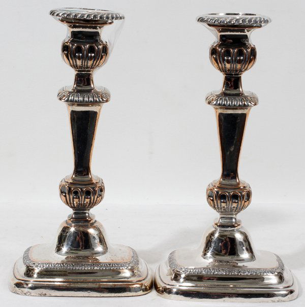 SHEFFIELD PLATE CANDLESTICKS, PAIR, H 10"