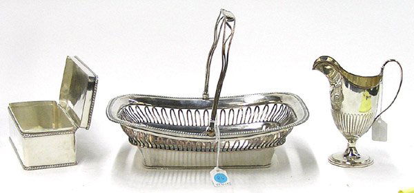 Sold(3) SILVER PLATE CAKE BASKET, KETTLE & PITCHER(lot of 3) Silver plate tableware, including: (1) cake basket, with reeded bail handle, basket with floral and openwork bands, rising on a reticulated foot, apparently unmarked, engraved shield with rSee Sold Price
