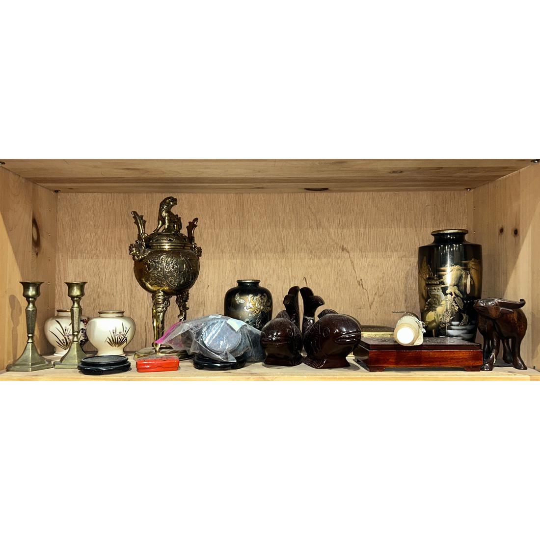 Shelf of mostly Japanese decorative objects