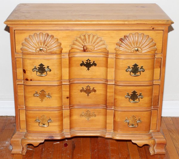SoldPA House sol mah block front bachelor chestPennsylvania House solid mahogany block front shell carved bachelor chest approx. 38" w x 20" d x 36" hSee Sold Price