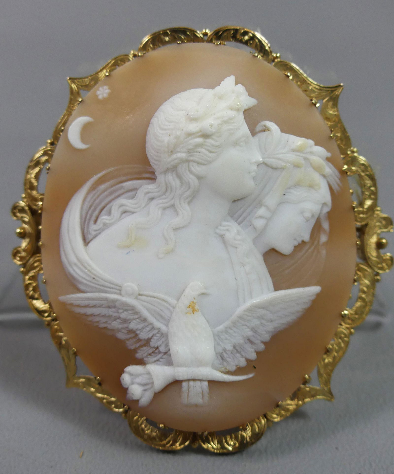 Antique 14K gold carved shell cameo pin/pendant. Engraved gold frame. Clasp markedTremont Auctions4.6(313)$200(1 bid)Mar 01, 2026