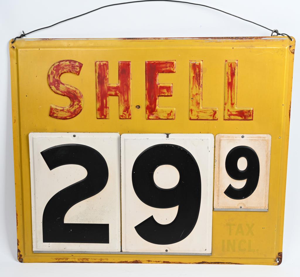 SoldShell Gasoline Embossed SST Pricer Sign32" x 38" SST embossed multi-piece sign has very good color and shine. The sign exhibits light general wear throughout with minor edge bends. Overall a nice embossed Shell sign with pricer attachmentsSee Sold Price