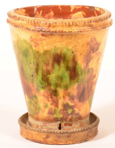 SoldShenandoah Valley Redware Flower Pot.Shenandoah Valley Polychrome Mottled Glaze Redware Flower Pot. Attributed to J. Eberly & Co., Strasburg, VA, Circa. 1885-1899. Double coggle wheel rim, tapered body, attached saucer base with coggle wSee Sold Price