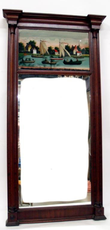 SHERATON MAHOGANY REVERSE PAINTED SHIP MIRROR