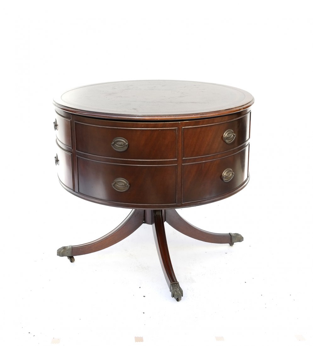 SoldSheraton Style Drum TableMahogany drum table with a tooled leather top and two drawers. [30" Dia x 26 3/4" H]. Overall good condition.See Sold Price