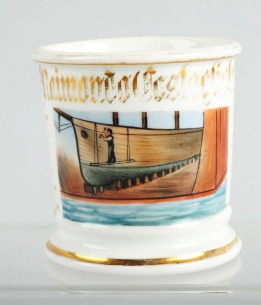 SoldCAPTAIN'S SHAVING MUG.Has the name "Captain D. G. Keeney" in gold gilt. Mug has detailed photo of steam-driven sail ship. Condition: (Excellent+). Dimensions: 4 - 1/2" x 3 - 1/2" x 3 - 1/2".See Sold Price