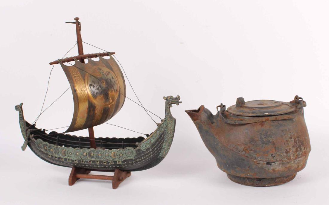 SoldChinese Ship ModelTogether with cast iron teapot. 7"h x 11"w Provenance: Property Sold for the Benefit of Greenwood Gardens, Short Hills, NJ.See Sold Price