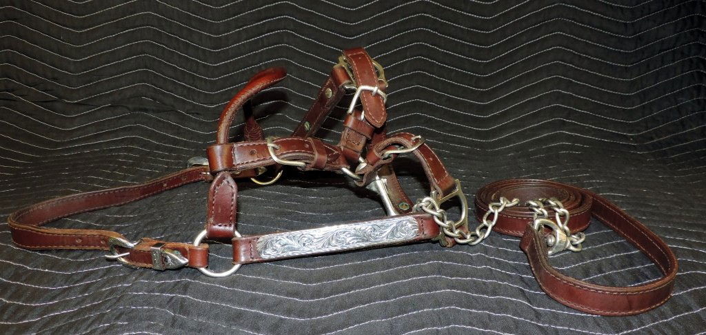 SoldHorse Training Halter, Lead Line & Grazing MuzzleIncludes Monty Roberts training halter, new 20ft horse training lead line, Monty Roberts lead line, grazing muzzle, and Equusology deciphering human and horse typology book.See Sold Price