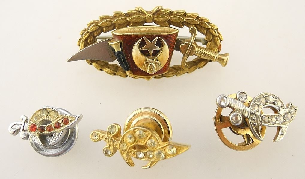 Four Shriners Pins: 1 x 10K / 1 x Sterling / 2 x Unmarked, TW 9.98 Grams.