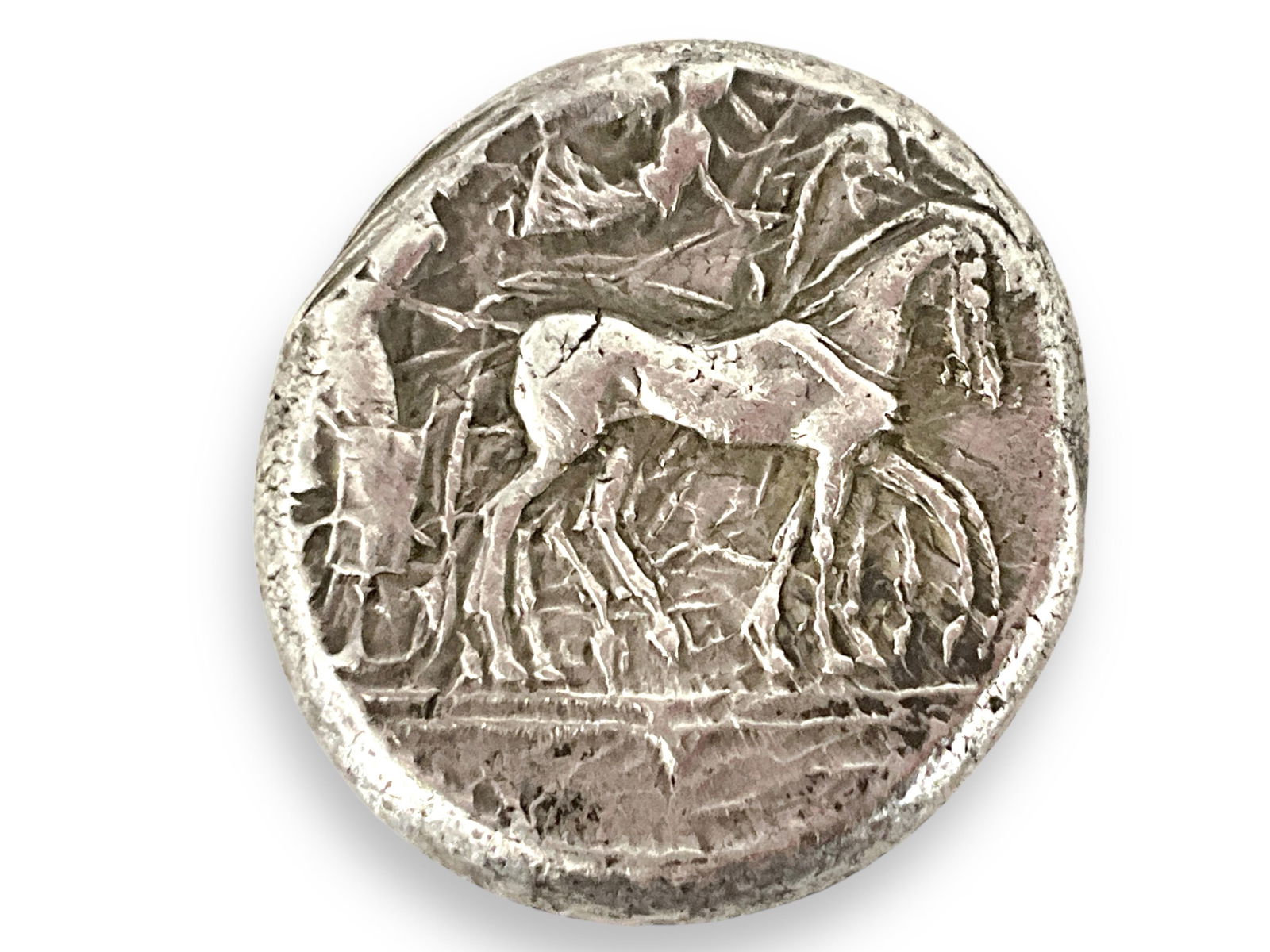 SoldSicily, Syracuse AR Tetradrachm Ancient CoinSicily, Syracuse AR Tetradrachm Ancient CoinTested silver composition, not professionally graded, 4th century BC, charioteer driving/head of Arethousa design, circulated condition, 22.5mm in diameter,See Sold Price