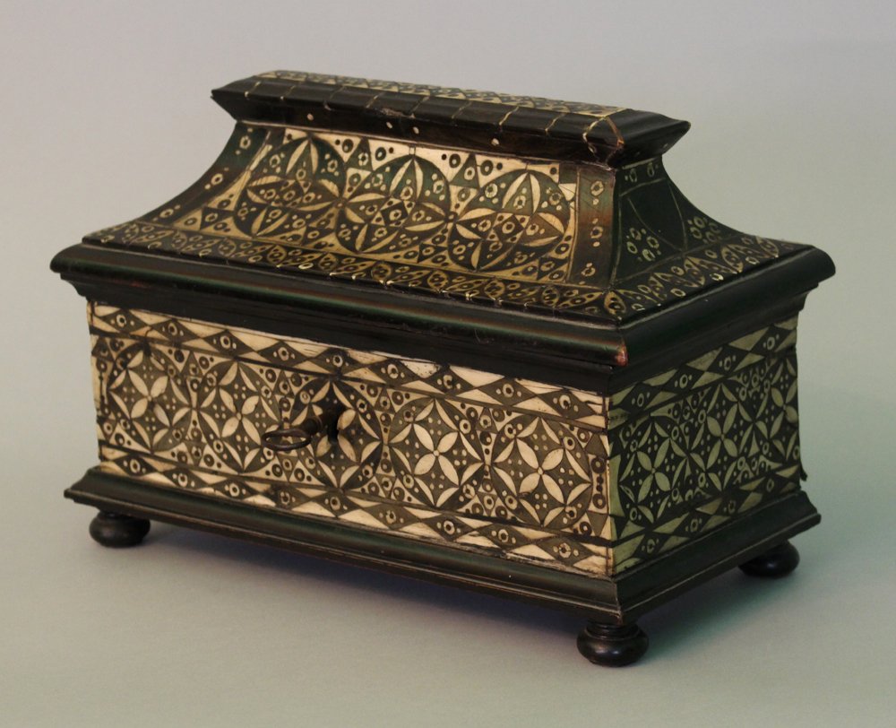Sienna ebony and ivory casket in rectangular shape with