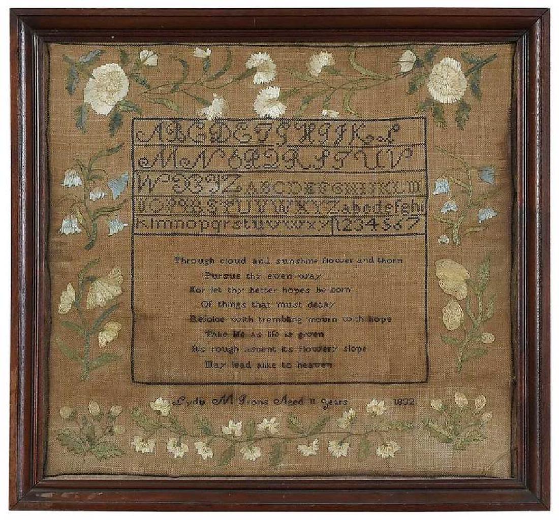 ELIZABETH MORSE (ROXBURY, MASSACHUSETTS, B. 1815) NEEDLEWORK SAMPLER, DATED 1827. Frame, 19.5"h.2 days LeftFINE AND RARE SUSAN TILTON (DANVILLE, VERMONT, B. 1813) NEEDLEWORK SAMPLER, DATED 1827. Frame, 17"h.2 days Left1804 SAMPLER BY SARAH STOCK5 days LeftELIZA ELDERD (AMERICAN) NEEDLEWORK SAMPLER, DATED 1806.2 days LeftEarly 19thC alphabet & verse sampler "Elizabeth Crane's work Aged 8 yrs August 3d 1824" - overall7 days LeftSALLY OSGOOD (ANDOVER, MASSACHUSETTS) NEEDLEWORK SAMPLER, DATED 1808. Frame, 20.5"h. 19.5"w.2 days LeftHANNAH SHED (AMERICAN, B. 1824) NEEDLEWORK SAMPLER, DATED 1833. Frame, 19"h. 18"w.2 days LeftAMERICAN NEEDLEWORK SAMPLER. Frame, 21."h. 23.75"w.2 days LeftSALLY ANN HOWARD (AMERICAN, B. 1824) NEEDLEWORK SAMPLER, DATED 1834. Frame, 12.5"h. 14.25"w.2 days LeftELIZA ANDERSON (AMERICAN, B. 1824) NEEDLEWORK SAMPLER, DATED 1836. Frame, 19"h. 16"w.2 days LeftSUSAN WHITNEY (AMERICAN) NEEDLEWORK SAMPLER. Frame, 18.25"h. 14"w.2 days LeftMARY CARTLIDGE (ENGLISH OR SCOTTISH, B. 1794) NEEDLEWORK SAMPLER. Frame, 16"h. 12"w.2 days Left