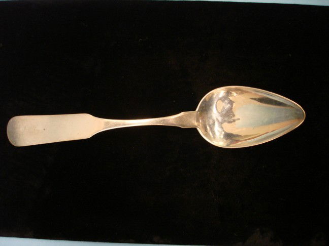 Grouping of 5 coin silver spoons including: Serving spoon signed J. Field - 9 3/4"L; ladle signed B.Grouping of 5 coin silver spoons including: Serving spoon signed J. Field - 9 3/4"L; ladle signed B. C. Van Fliet, Pokeepsie (NY) - 7"L; 2 dinner spoons signed C.B. Po'keepsie; and serving spoon signe