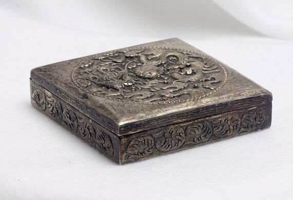 Signed Antique Tibetan Dragon Design Silver Box.