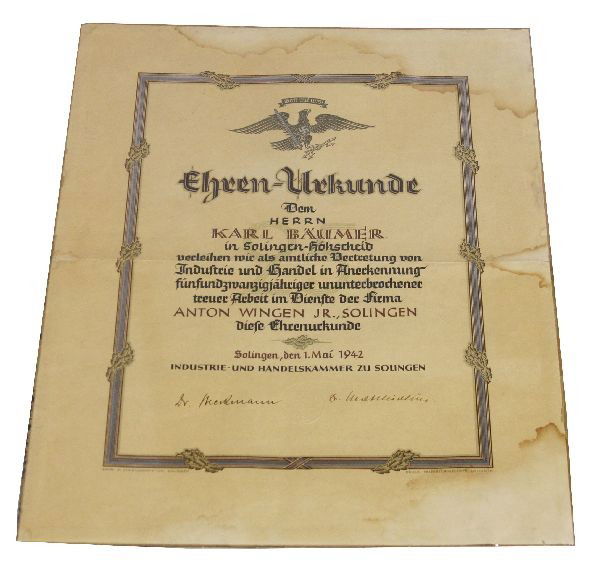 SIGNED ANTON WINGEN JR SOLINGEN AWARD DOCUMENT