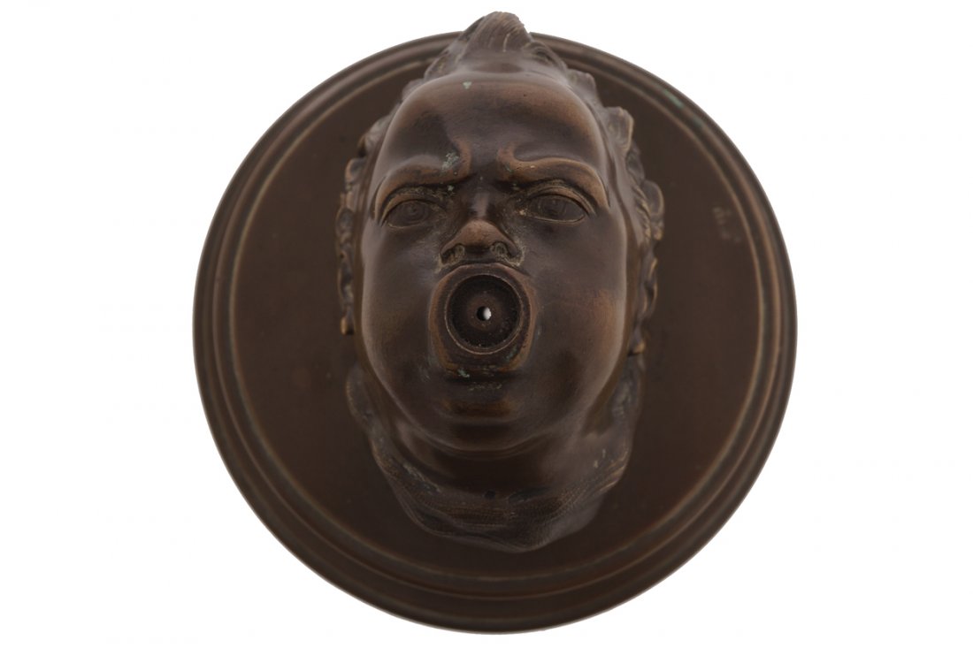 Signed bronze cherub mask mounted plaque