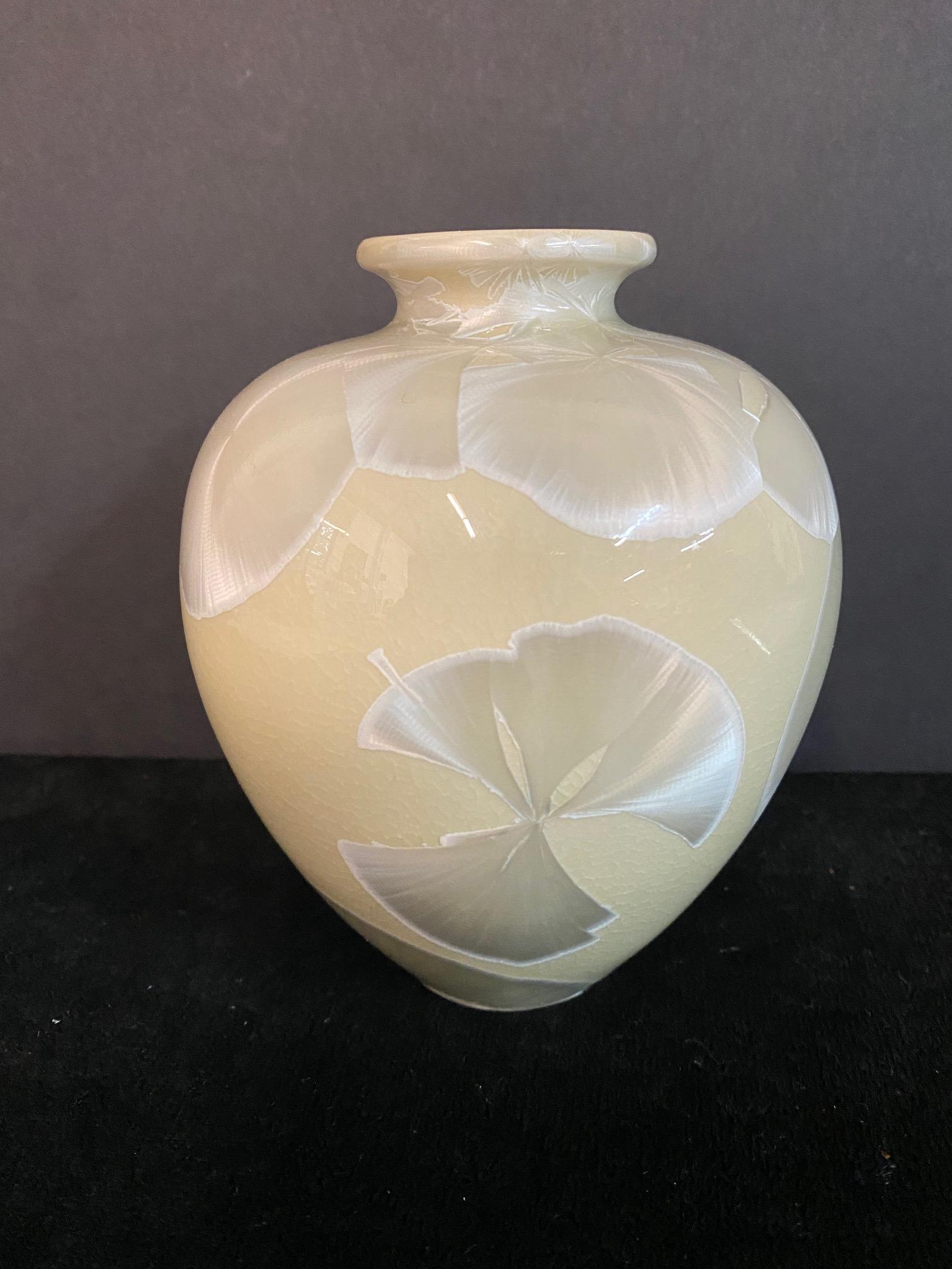 SIGNED CERAMIC VASE W/ IRRIDESCENT LEAVES 5.5"