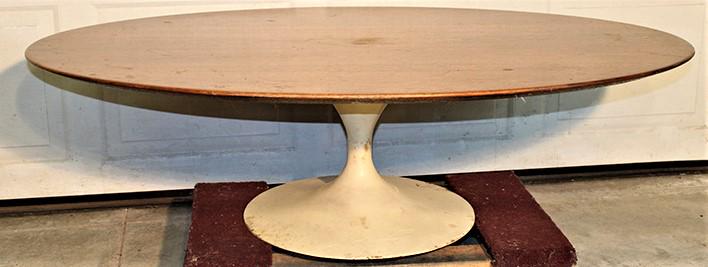 SoldEero Saarinen for Knoll International, Mid-Century "Tulip" coffee tableMid-Century (Late 1950s) Finnish Tulip wooden oval coffee table top supported by a white enameled circular metal base. (EERO SAARINEN FOR KNOLL INTERNATIONAL)Dimensions: 53"w x 36"d x 0.5"hSee Sold Price