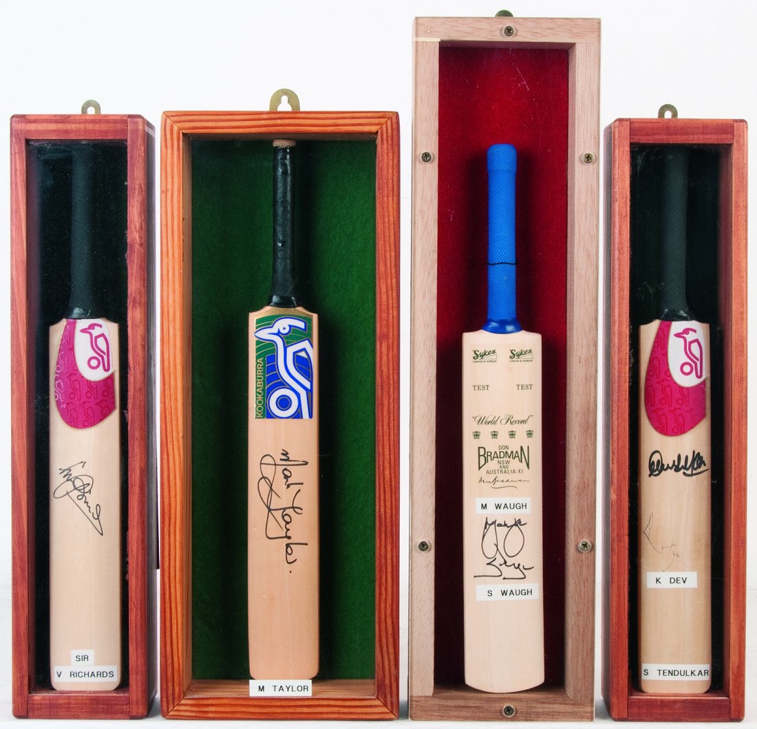 SIGNED MINIATURE BATS, in four small display cases,