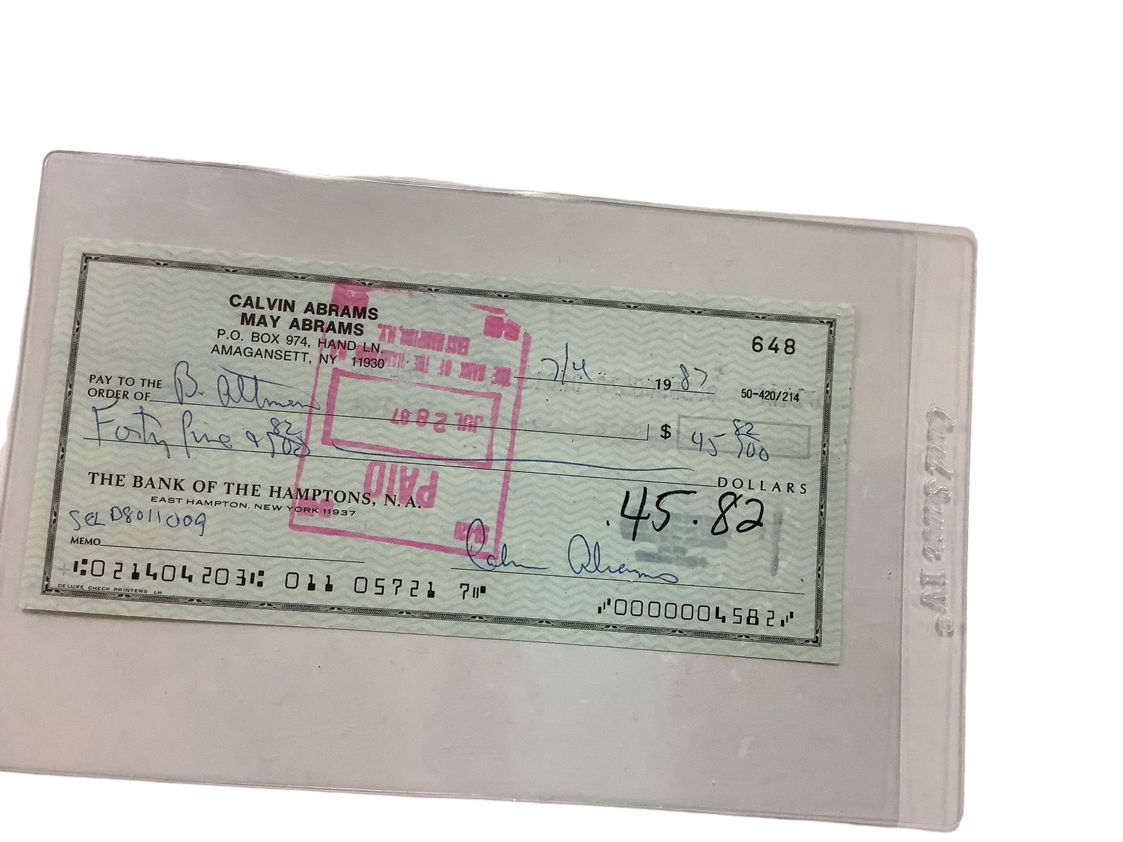 Signed Personal Check by Calvin Abrams (MLB)