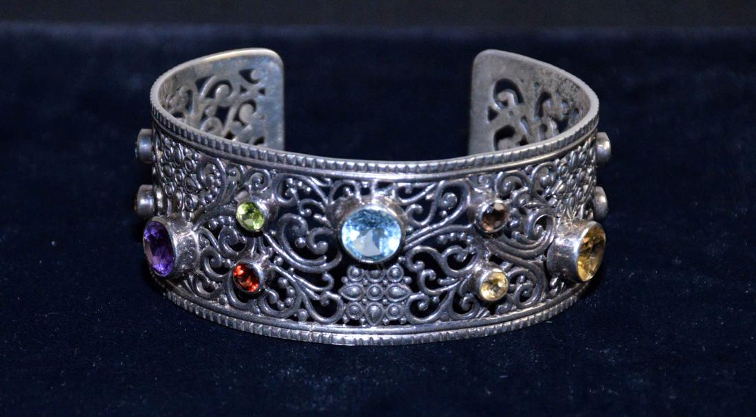 SoldBJC Samuel Benham 18kt Sterling Silver Multi gemstone Filigree Wide cuff braceletSTAMPED: BJC Samuel B. 925. DETAILS: Beautiful Wide Scroll Filligree Sterling cuff with 11 multi color gemstones in Aquamarine, Amethyst, Tourmaline, Citrine, blue Topaz In assorted sizes. DIMENSION:See Sold Price