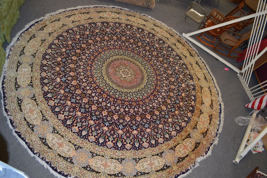 SoldCIRCULAR TABRIZ SILK AND WOOL RUG, - D: app. 6 ft. 9 in.CIRCULAR TABRIZ SILK AND WOOL RUG. Depicting animals and flowers. - D: app. 6 ft. 9 in.See Sold Price