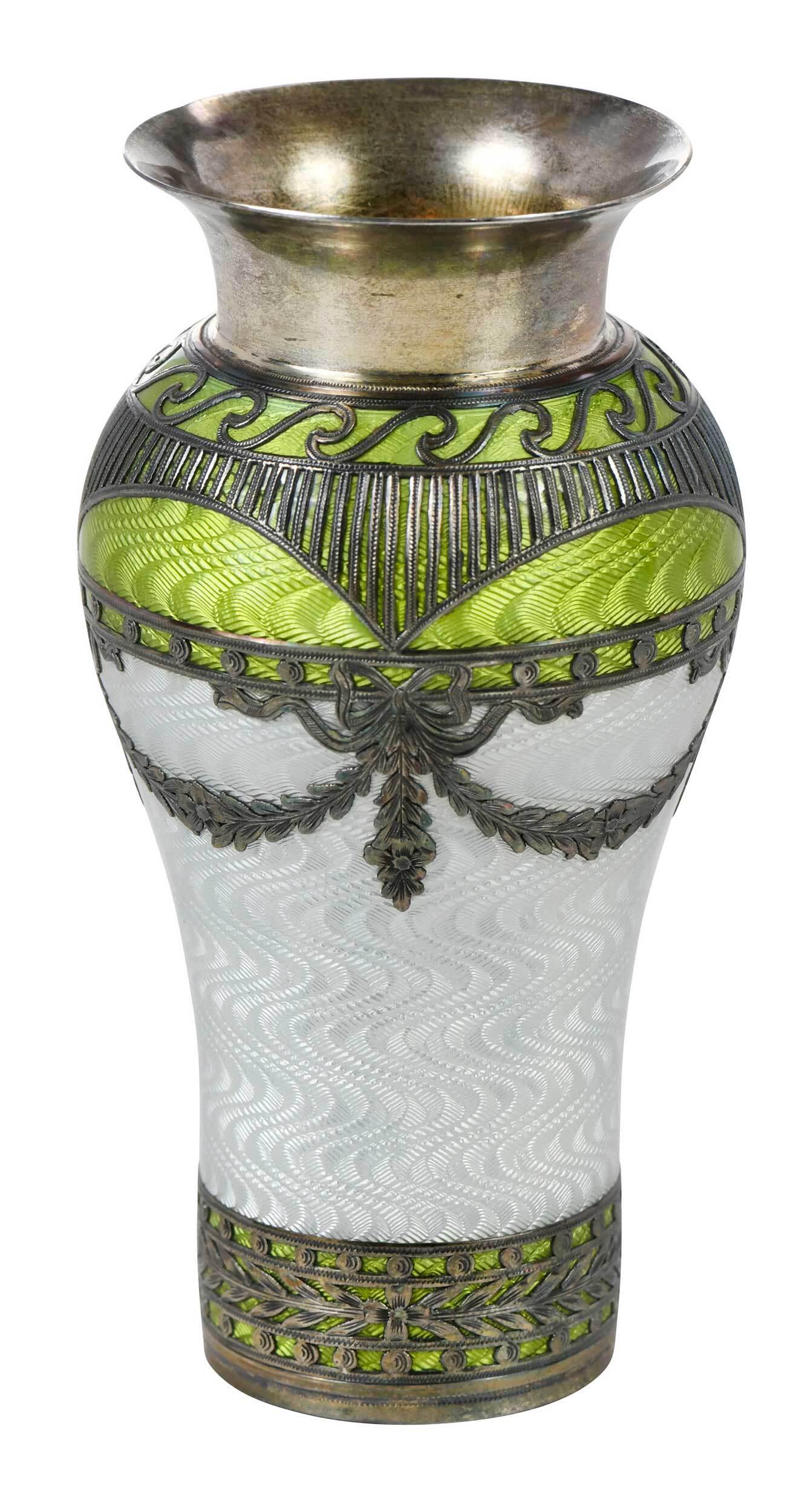 SoldA Large Russian Silver & Cloisonne Enamel Lidded VaseA large Faberge Style Russian Silver and Cloisonne Enamel Lidded Vase. Weight: 759 Grams. H 11.1/2"See Sold Price