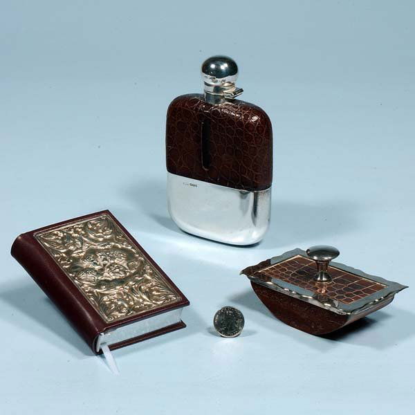 Silver and leather flask, silver and leather blott