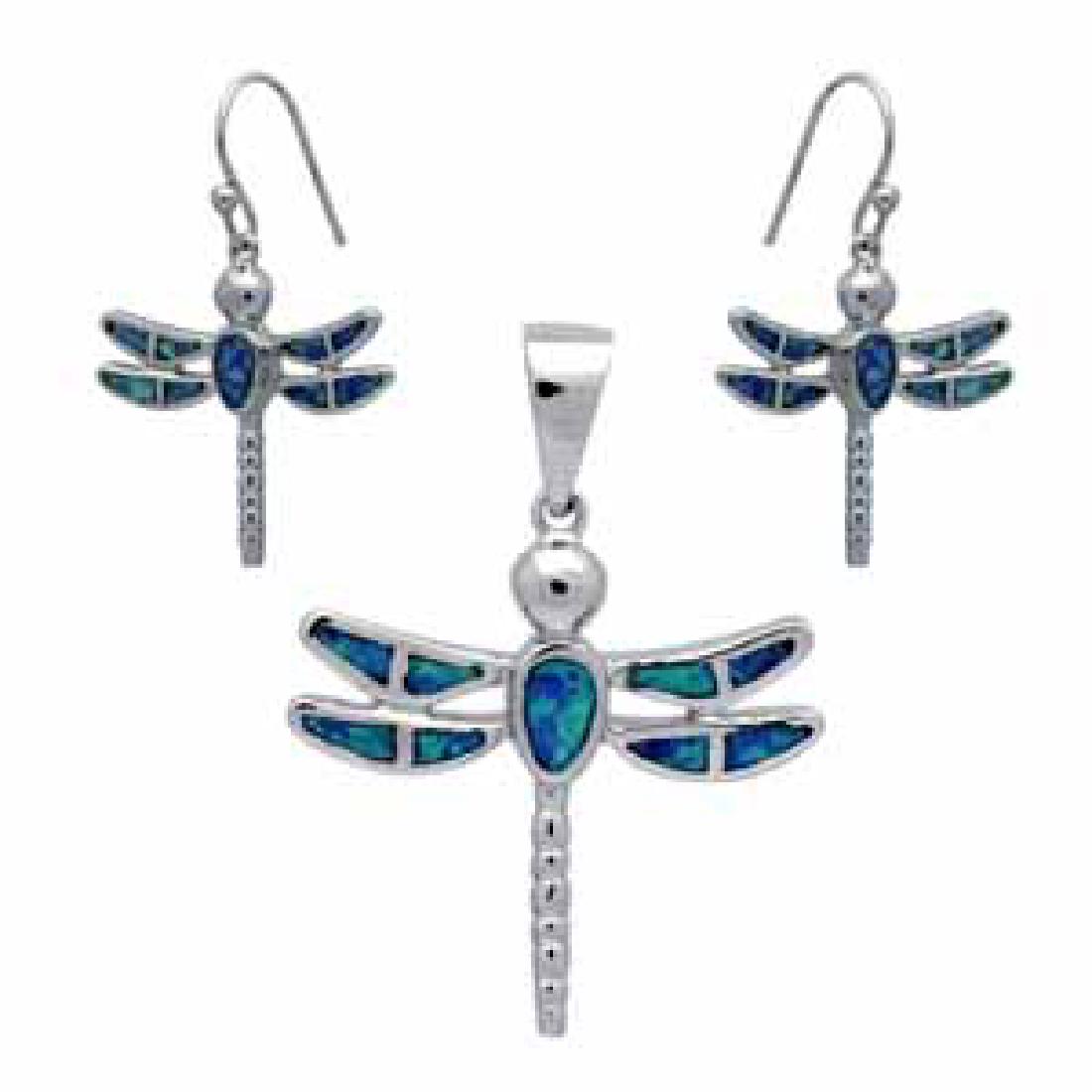 SILVER BLUE OPAL DRAGONFLY PENDANT EARRINGS SET