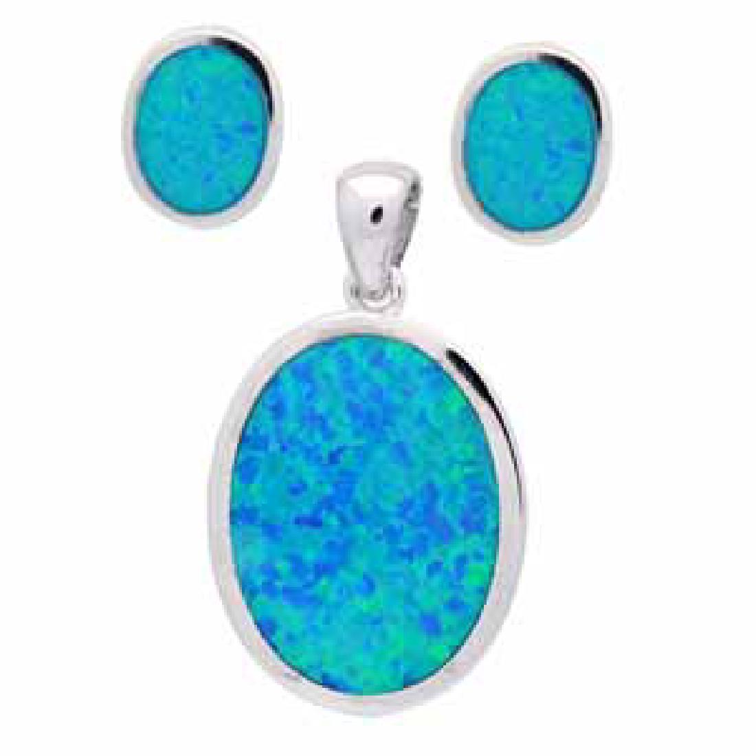 SILVER BLUE OPAL OVAL PENDANT EARRINGS SET