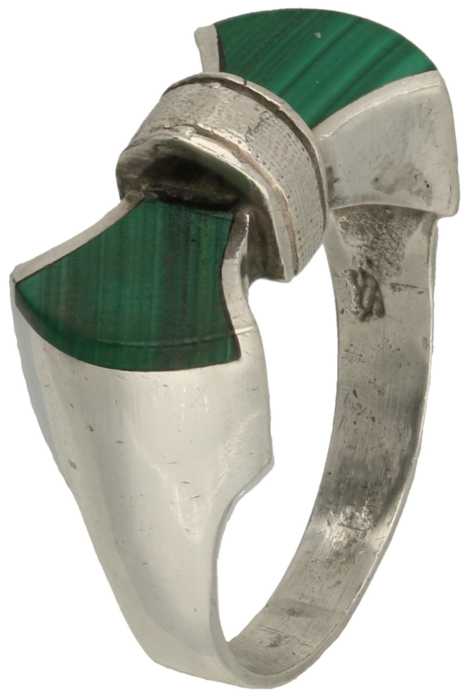 Silver bow-shaped ring, malachite - 835/1000.