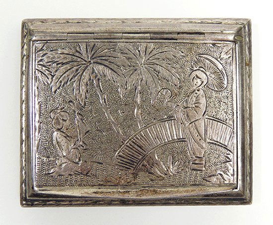 Vintage Silver Plate Jewelry BoxMar 10, 2026A Russian 84 Silver Cigarette Box3 days LeftGerman Sterling Silver Repoussé Snuff Box Pendant, Figural Scene, 19th CenturyFeb 20, 2026Art Deco 800 Silver Cigarette Case with Gilt InteriorFeb 21, 2026Thai circa 1950 A large mid-20th century silver casket or boxFeb 18, 2026Russian Silver & Niello Cigarette CaseMar 03, 2026Rangoon circa 1910 An early 20th century Burmese silver cigarette or cigar boxFeb 18, 2026A SILVER AMULET. Probably Iraq or Morocco, c. 1900.Feb 18, 2026A silver cigarette box,Canton circa 1860 marked Khe Cheong A mid-19th century Chinese silver snuff boxFeb 18, 2026Antique Chinese silver jewelry box with intricate enamel of ducks in the pond4 days Left800 German Silver Parcel gilt Snuff Box Hand chased Repousse genre scene3 days LeftA Qing Dynasty silver engraved character story pattern boxMar 07, 2026A SILVER JUDAIC CASKET. Rome, 1700.Feb 18, 2026Russian Silver Cigarette CaseMar 03, 2026German 750 Silver Vinaigrette Box Kecker Before 1886Feb 22, 2026