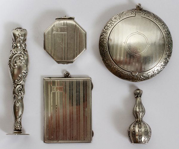 Antique 800 Silver Compacts and 84 Silver Cups LOTFeb 25, 2026An Estate Lot of Eight Lockets, Late 20th Century, 90FK3 days LeftLot of sterling silver dresser accessories, including various covered glass jars and scent bottles.Mar 01, 2026Lot of sterling silver accessories and tableware. To include: Chinese wise man figural shakers, O.Mar 01, 2026GROUP LOT OF SILVER ITEMSFeb 25, 2026LOT OF COMPASSES, BADGE, AUTO CLOCKFeb 26, 20266 ASST COIN/STERLING INCL. REPOSE PILL BOX6 days LeftLarge Lighter Collection 60+pc Zippo Ronson Table/Pocket etc7 days LeftGroup of Smoking & Other AccessoriesMar 03, 2026Compacts, Niagara Falls Souvenir Pill Box, Older Cigarette Case and Zippo LighterFeb 26, 2026Collection of antique aide-memoires, dance cards and pocket notebooks6 days LeftGroup of Vanity Items Including Tiffany, 8 pcsFeb 26, 2026A selection of silver, Late 19th / early 20th century,Collection of Antique Sterling Silver Objects and Accessories6 days LeftA GROUP OF ENGLISH SILVER BOXES, 112gFeb 25, 2026Group of Silver Dressing ArticlesFeb 25, 2026