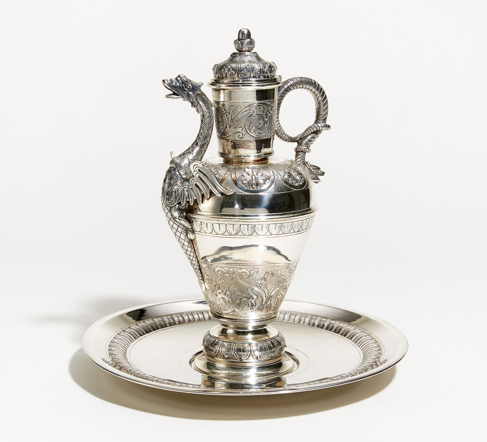 Silver ewer with dragon decor and basin