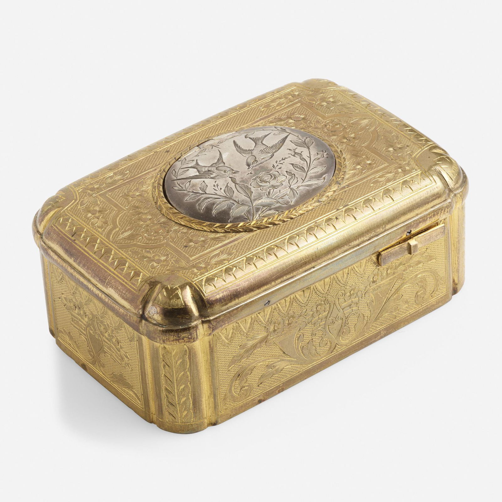 Vintage Silver Plate Jewelry BoxMar 10, 2026A George IV silver-gilt and gold mounted snuff box Alexander J Strachan, London 1824A Precious Gilt-Bronze Silver White Jade-Inlaid 'Bird& Flower' BoxMar 06, 2026A Gorgeous Gilt-Silver 'Buddha Shakyamuni' Box With A Scroll Of Buddhist SutrasMar 06, 2026Gilt Base Metal Ornate Hinged Box with Cabochon Accents3 days LeftA silver cigarette box,AN 18TH CENTUIRY GOLD MOUNTED AGATE SNUFF BOX2 days LeftA Russian 84 Silver Cigarette Box18 hrs LeftA SILVER SMOKER'S BOX AND COMPENDIUM2 days LeftJean-Jacques Prevost 1766 18K Gold Floral Jewelry BoxFeb 27, 2026Elegant Neoclassical Jewelry Box with Brass Hardware and Felt Interior3 days LeftA Exquisite Gilt Bronze Inlaid White Jade Lotus Pattern Character and Story Pattern BoxMar 13, 2026A Brilliant Gilt-Bronze Silver White Jade-Inlaid 'Flower& Figure' BoxMar 06, 2026England circa 1750 A George II unmarked silver table double snuff box3 days LeftAn unusual and good silver, gold piqué and tortoiseshell casket William Comyns, London 1911A Brilliant Gilt-Bronze White Jade-Inlaid 'Figure& Flower' BoxMar 06, 2026