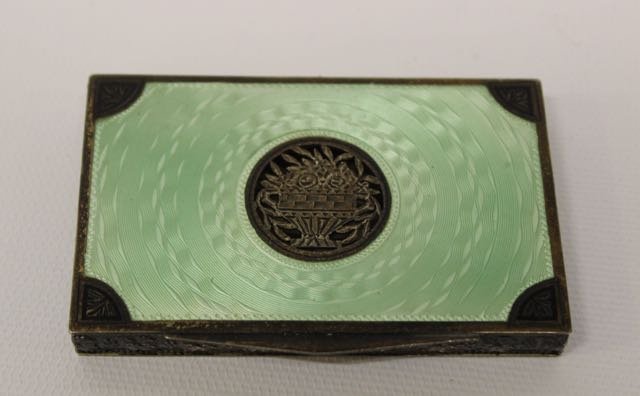 SoldSILVER GUILLOCHE BOXMADE IN AUSTRIA - ENAMELED GUILLOCHE SILVER BOX - INTERIOR GOLD WASH - FLORAL INSERT - 9.33 OZT Dimensions: 4"x3"X1"See Sold Price